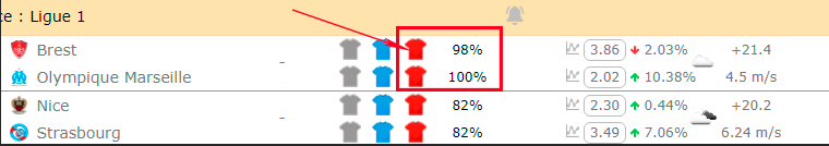 Стартовые составы команд, как правило, появляются за 65-45 минут до начала матча в различных источниках. Наша команда согласно расписанию, в автоматическом и ручном режиме мониторит за появлением. О наличии стартовых состав команд сигнализирует иконка -  красная маечка. Рядом с иконкой будет отображаться процент "Оптимального стартового состава". Данный процент считается так: