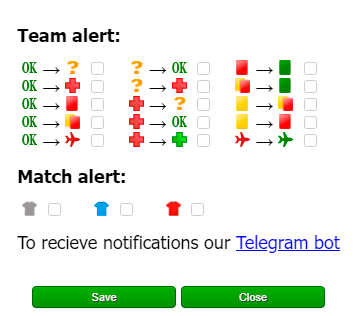 Здесь представлены все возможные варианты изменений в составе команд. Например, выбрав ОК-"Травма", вы будете получать оповещение в Телеграм бот по всем командам 5-ти чемпионатов в случае, если игрок получит травму.