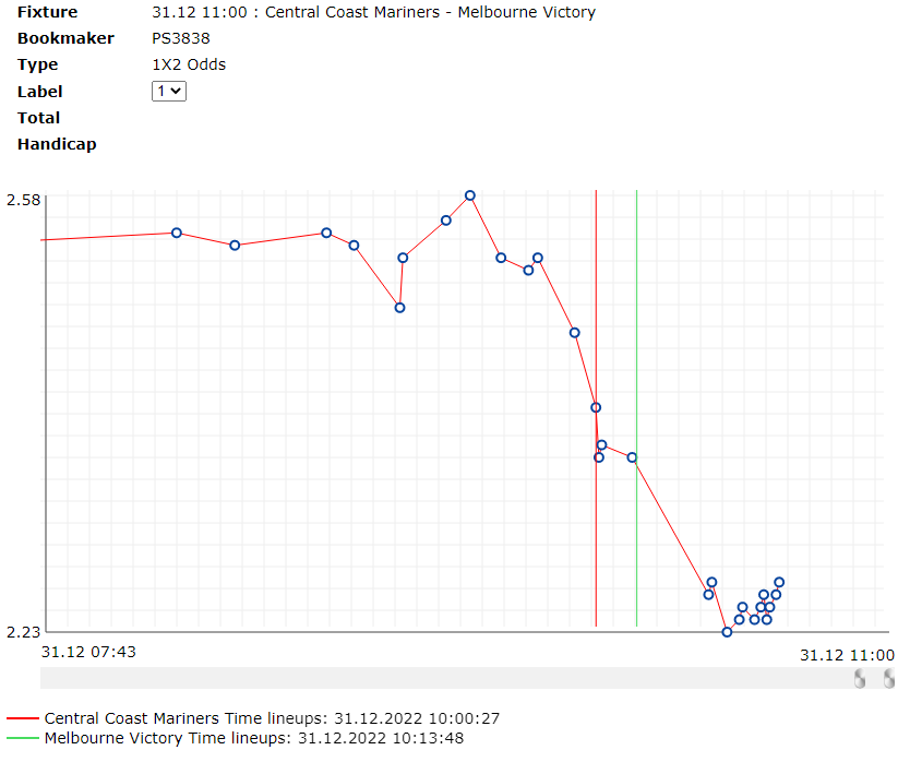 Where the red and green vertical line is the time on the schedule of the appearance of the starting line-up by teams. If the starting line-up appears at the same time, then there will be one red vertical line on the odds movement chart.