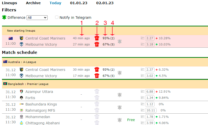 If the starting line-up of the teams appears separately, then a red T-shirt with the number of the order of appearance of the starting line-up 1 or 2 is displayed opposite the team. The time of departure of the starting lineups is fixed on the graph of the movement of the odds: